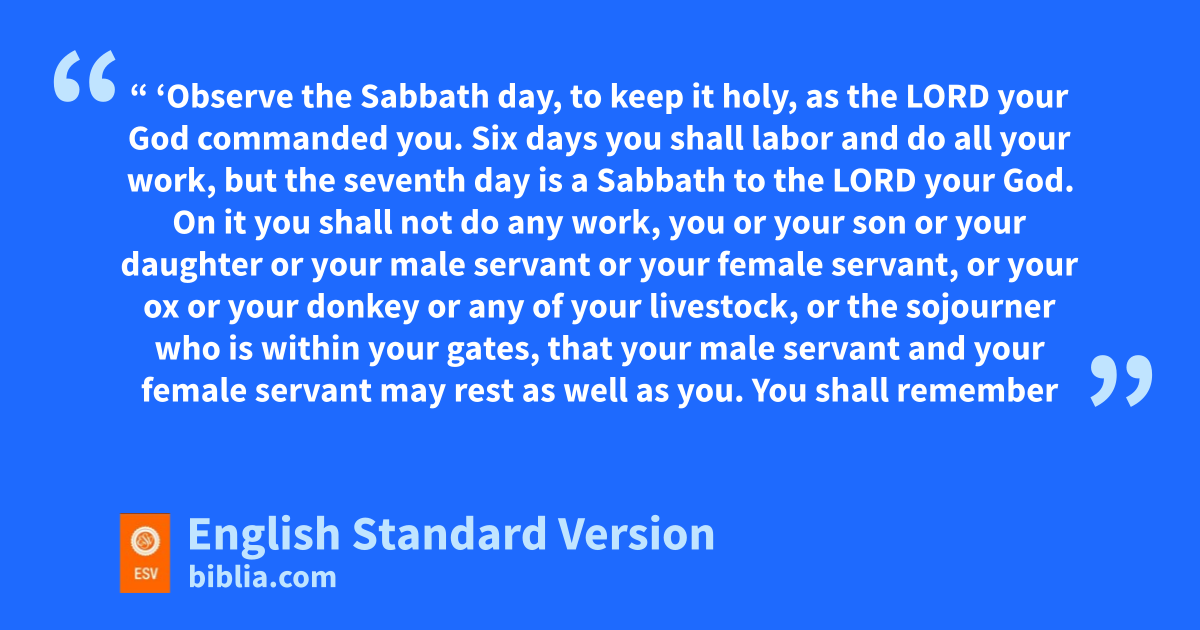 12 “ ‘Observe the Sabbath day, to keep it holy, as the Lord your God commanded you. 13 Six days you shall labor and do all your work, 14 but ethe seventh day is a Sabbath to the Lord your God. On it you shall not do any work, you or your son or your daughter or your male servant or your female servant, or your ox or your donkey or any of your livestock, or the sojourner who is within your gates, fthat your male servant and your female servant may rest as well as you. 15 gYou shall remember that you were a slave3 in the land of Egypt, and the Lord your God brought you out from there hwith a mighty hand and an outstretched arm. Therefore the Lord your God commanded you to keep the Sabbath day.