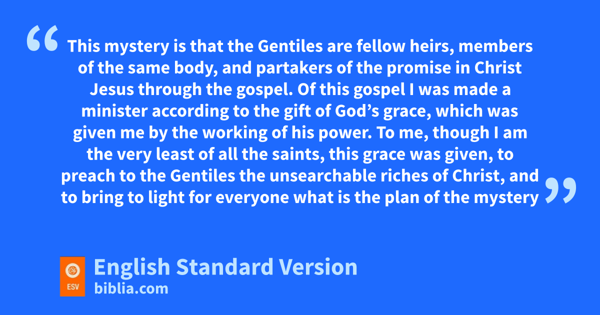 3 For this reason I, Paul, oa prisoner of Christ Jesus pon behalf of you Gentiles— 2 assuming that you have heard of qthe stewardship of rGod’s grace that was given to me for you, 3 show the mystery was made known to me tby revelation, uas I have written briefly. 4 vWhen you read this, you can perceive my insight into wthe mystery of Christ, 5 which was not made known to the sons of men in other generations as it has now been revealed to his holy apostles and prophets by the Spirit. 6 This mystery is1 that the Gentiles are xfellow heirs, ymembers of the same body, and zpartakers of the promise in Christ Jesus through the gospel.