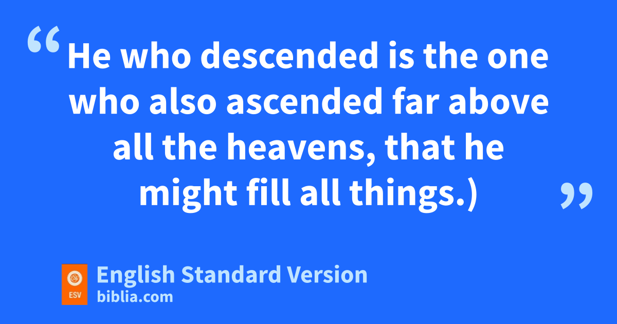 9 (hIn saying, “He ascended,” what does it mean but that he had also descended into ithe lower regions, the earth?2 10 He who descended is the one who also jascended kfar above all the heavens, that he might lfill all things.) 11 And mhe gave the napostles, the prophets, the oevangelists, the pshepherds3 and teachers,4 12 qto equip the saints for the work of ministry, for rbuilding up sthe body of Christ, 13 until we all attain to tthe unity of the faith and of the knowledge of the Son of God, uto mature manhood,5 to the measure of the stature of vthe fullness of Christ, 14 so that we may no longer be children, wtossed to and fro by the waves and carried about by every wind of doctrine, by human cunning, by craftiness in xdeceitful schemes. 15 Rather, yspeaking the truth in love, we are to zgrow up in every way into him who is athe head, into Christ, 16 bfrom whom the whole body, joined and held together by every joint with which it is equipped, cwhen each part is working properly, makes the body grow so that it builds itself up in love.