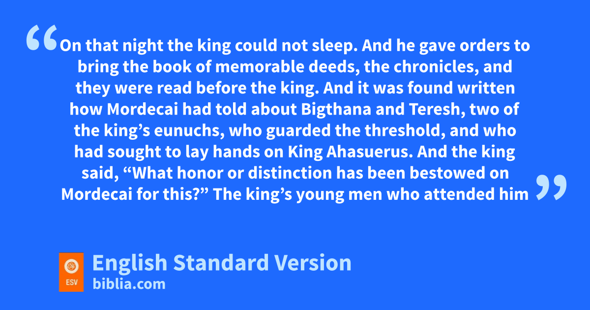 6 On that night the king could not sleep. And he gave orders to bring othe book of memorable deeds, the chronicles, and they were read before the king. 2 And it was found written how pMordecai had told about qBigthana1 and rTeresh, two of the king’s eunuchs, who guarded the threshold, and who had sought to lay hands on King Ahasuerus. 3 And the king said, “What honor or distinction has been bestowed on Mordecai for this?” The king’s young men who attended him said, “Nothing has been done for him.” 4 And the king said, “Who is in the court?” Now Haman had just entered sthe outer court of the king’s palace to speak to the king about having Mordecai hanged on tthe gallows2 that he had prepared for him. 5 And the king’s young men told him, “Haman is there, standing in the court.” And the king said, “Let him come in.” 6 So Haman came in, and the king said to him, “What should be done to the man uwhom the king delights to honor?” And Haman said to himself, “Whom would the king delight to honor more than me?” 7 And Haman said to the king, “For the man whom the king delights to honor, 8 let royal robes be brought, which the king has worn, vand the horse that the king has ridden, and on whose head wa royal crown3 is set. 9 And let the robes and the horse be handed over to one of the king’s most noble officials. Let them dress the man whom the king delights to honor, and let them lead him on the horse through the square of the city, xproclaiming before him: ‘Thus shall it be done to the man whom the king delights to honor.’ ” 10 Then the king said to Haman, “Hurry; take the robes and the horse, as you have said, and do so to Mordecai the Jew, who sits yat the king’s gate. Leave out nothing that you have mentioned.” 11 So Haman took the robes and the horse, and he dressed Mordecai and led him through the square of the city, proclaiming before him, “Thus shall it be done to the man whom the king delights to honor.”