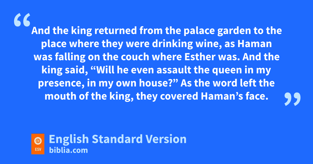 7 And the king arose in his wrath from the wine-drinking and went into ithe palace garden, but Haman stayed to beg for his life from Queen Esther, for he saw that harm was determined against him by the king. 8 And the king returned from ithe palace garden to the place where they were drinking wine, as Haman was falling on jthe couch where Esther was. And the king said, “Will he even assault the queen in my presence, in my own house?” As the word left the mouth of the king, they covered Haman’s face. 9 Then kHarbona, one of the eunuchs in attendance on the king, said, “Moreover, lthe gallows2 that Haman has prepared for Mordecai, mwhose word saved the king, is standing at Haman’s house, fifty cubits3 high.” And the king said, “Hang him on that.” n10 So they hanged Haman on the gallows that he had prepared for Mordecai. oThen the wrath of the king abated.