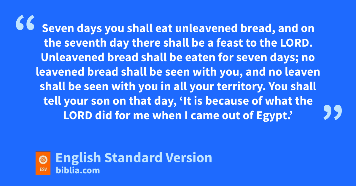 3 Then Moses said to the people, p“Remember this day in which you came out from Egypt, out of the house of slavery, qfor by a strong hand the Lord brought you out from this place. rNo leavened bread shall be eaten. 4 Today, in the month of sAbib, you are going out. 5 And when the Lord brings you into tthe land of the Canaanites, the Hittites, the Amorites, the Hivites, and the Jebusites, which uhe swore to your fathers to give you, a land vflowing with milk and honey, wyou shall keep this service in this month. 6 xSeven days you shall eat unleavened bread, and on the seventh day there shall be a feast to the Lord. 7 Unleavened bread shall be eaten for seven days; no leavened bread shall be seen with you, and no leaven shall be seen with you in all your territory. 8 yYou shall tell your son on that day, ‘It is because of what the Lord did for me when I came out of Egypt.’ 9 And it shall zbe to you as a sign on your hand and as aa memorial zbetween your eyes, that the law of the Lord may be in your mouth. For with a strong hand the Lord has brought you out of Egypt. 10 bYou shall therefore keep this statute at its appointed time from year to year.
