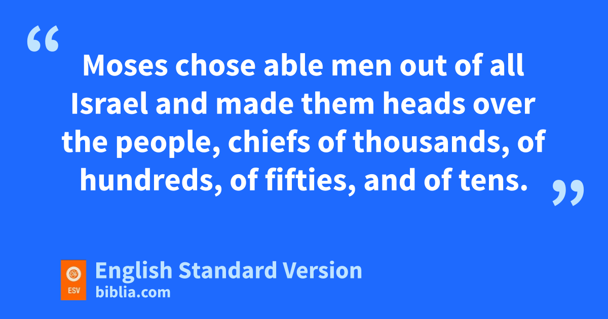24 So Moses listened to the voice of his father-in-law and did all that he had said. 25 mMoses chose able men out of all Israel and made them heads over the people, chiefs of thousands, of hundreds, of fifties, and of tens. 26 And nthey judged the people at all times. Any hard case they brought to Moses, but any small matter they decided themselves. 27 Then Moses let his father-in-law depart, and ohe went away to his own country.