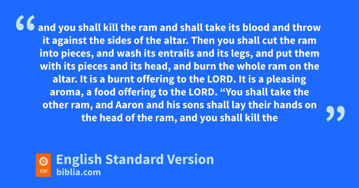 15 “Then syou shall take one of the rams, and tAaron and his sons shall lay their hands on the head of the ram, 16 and you shall kill the ram and shall take its blood and throw it against the sides of the altar. 17 Then you shall ucut the ram into pieces, and wash its entrails and its legs, and put them with its pieces and its head, 18 and burn the whole ram on the altar. It is a burnt offering to the Lord. It is a vpleasing aroma, a food offering2 to the Lord.