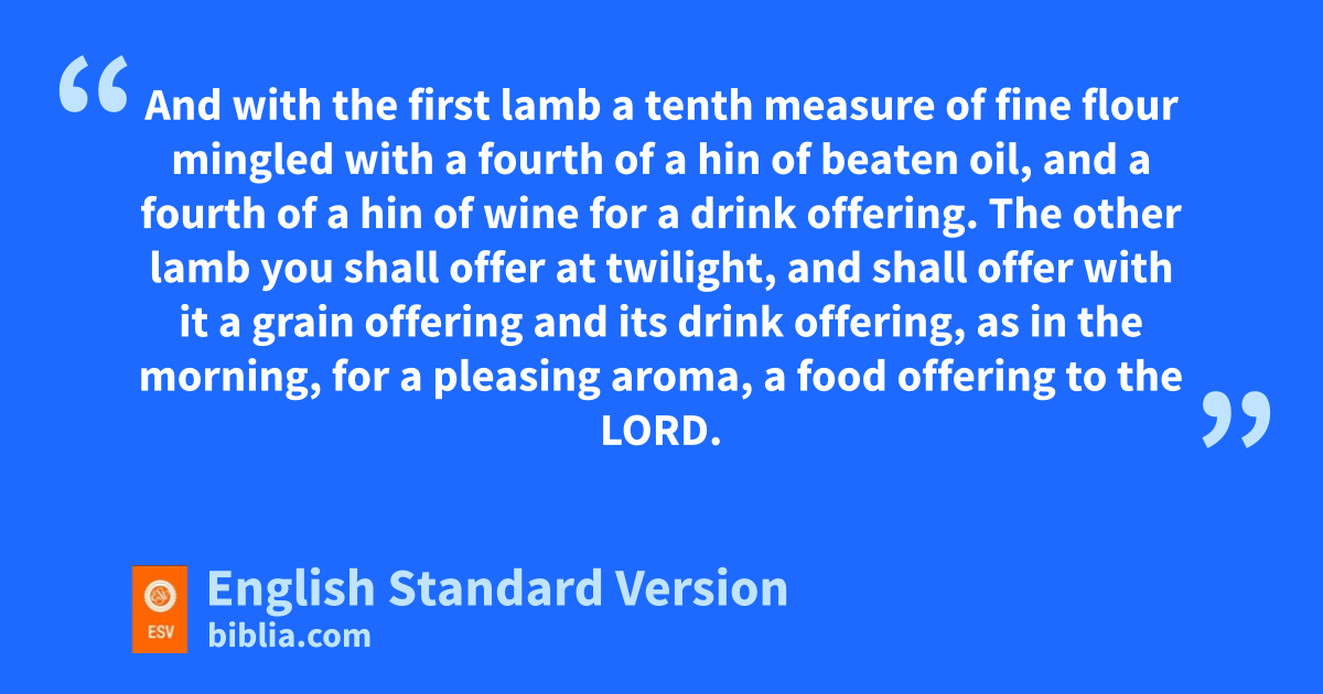38 “Now this is what you shall offer on the altar: xtwo lambs a year old yday by day regularly. 39 One lamb you shall offer zin the morning, and the other lamb you shall offer aat twilight. 40 And with the first lamb a tenth measure3 of fine flour mingled with a fourth of a hin4 of beaten oil, and a fourth of a hin of wine for a drink offering. 41 The other lamb you shall offer aat twilight, and shall offer with it a grain offering and its drink offering, as bin the morning, for a cpleasing aroma, a food offering to the Lord. 42 It shall be a dregular burnt offering throughout your generations at the entrance of the tent of meeting before the Lord, ewhere I will meet with you, to speak to you there. 43 There I will meet with the people of Israel, and it shall be fsanctified by my glory. 44 I will consecrate the tent of meeting and the altar. gAaron also and his sons I will consecrate to serve me as priests. 45 hI will dwell among the people of Israel and will be their God. 46 And they shall know that iI am the Lord their God, who brought them out of the land of Egypt that I might dwell among them. I am the Lord their God.