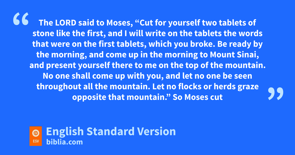 34 The Lord said to Moses, w“Cut for yourself two tablets of stone like the first, xand I will write on the tablets the words that were on the first tablets, ywhich you broke. 2 Be ready by the morning, and come up in the morning to Mount Sinai, and present yourself there to me zon the top of the mountain. 3 No aone shall come up with you, and let no one be seen throughout all the mountain. Let no flocks or herds graze opposite that mountain.” 4 So Moses cut two tablets of stone like the first. And he rose early in the morning and went up on Mount Sinai, as the Lord had commanded him, and took in his hand two tablets of stone. 5 The Lord bdescended in the cloud and stood with him there, and cproclaimed the name of the Lord. 6 The Lord passed before him and proclaimed, d“The Lord, the Lord, a God merciful and egracious, slow to anger, and abounding in steadfast flove and faithfulness, 7 gkeeping steadfast love for thousands,1 hforgiving iniquity and transgression and sin, but iwho will by no means clear the guilty, jvisiting the iniquity of the fathers on the children and the children’s children, to the third and the fourth generation.” 8 And Moses quickly kbowed his head toward the earth and worshiped. 9 And he said, “If now I have found favor in your sight, O Lord, please llet the Lord go in the midst of us, for mit is a stiff-necked people, and pardon our iniquity and our sin, and take us for nyour inheritance.”