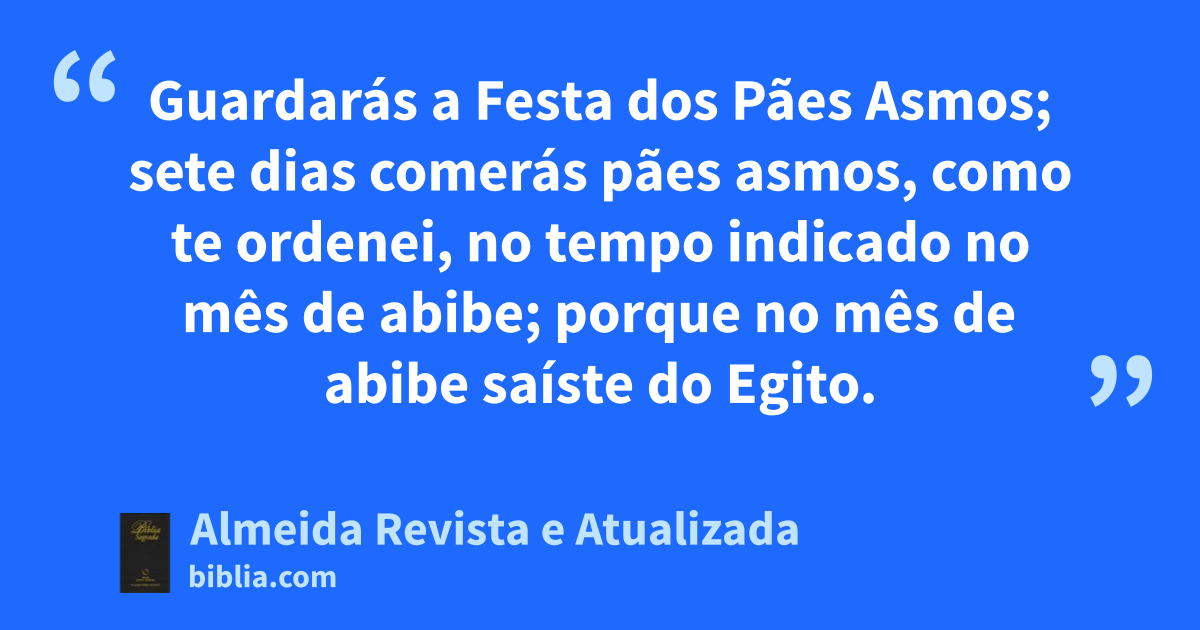 18 Guardarás a Festa dos Pães Asmosd; sete dias comerás pães asmos, como te ordenei, no tempo indicado no mês de abibe; porque no mês de abibe saíste do Egito. 19 Todo o que abre a madre é meu; também de todo o teu gado, sendo macho, o que abre a madre de vacas e de ovelhas. 20 O jumento, porém, que abrir a madre, resgatá-lo-ás com cordeiro; mas, se o não resgatares, será desnucado. Remirás todos os primogênitos de teus filhos. Ninguém aparecerá diante de mim de mãos vazias.e