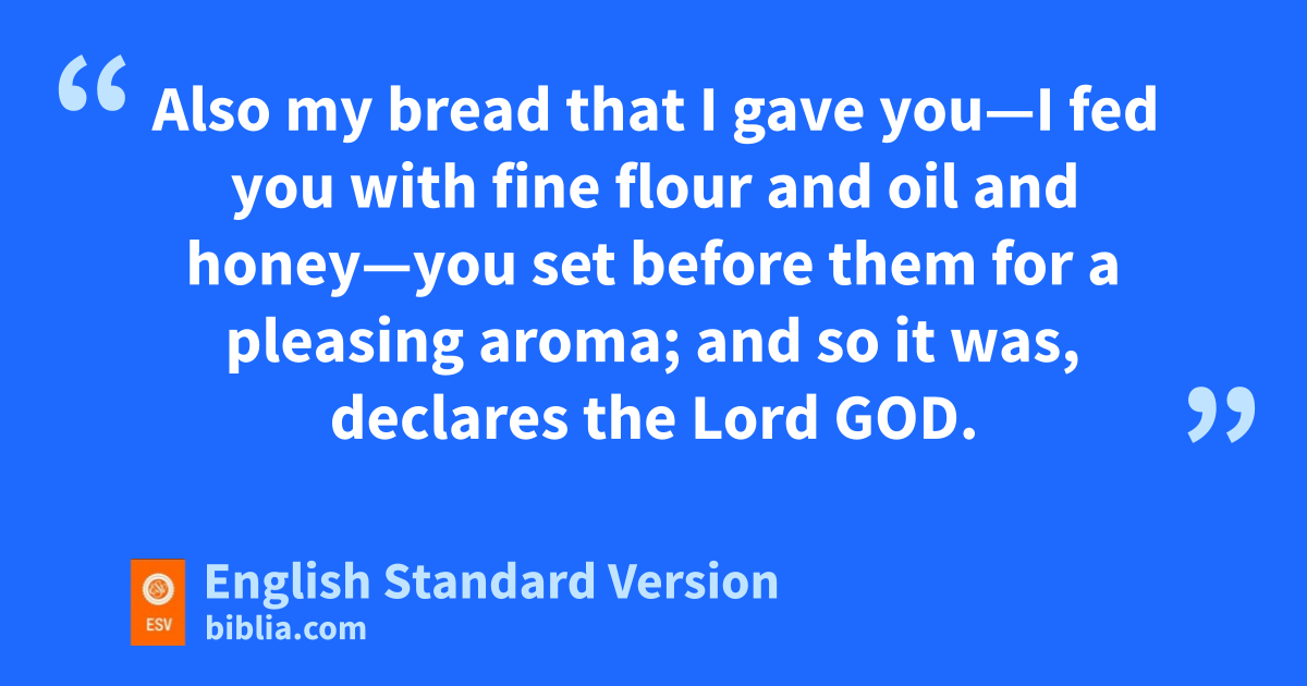 15 v“But you trusted in your beauty wand played the whore2 because of your renown xand lavished your whorings3 on any passerby; your beauty4 became his. 16 You took some of your garments and made for yourself colorful shrines, and on them played the whore. The like has never been, nor ever shall be.5 17 You also took yyour beautiful jewels of my gold and of my silver, which I had given you, and zmade for yourself images of men, and with them played the whore. 18 And you took your embroidered garments to cover them, aand set my oil and my incense before them. 19 bAlso my bread that I gave you—sI fed you with fine flour and oil and honey—you set before them for ca pleasing aroma; and so it was, declares the Lord God. 20 dAnd you took your sons and your daughters, whom you had borne to me, and ethese you sacrificed to them to be devoured. Were your whorings so small a matter 21 that you slaughtered my children and delivered them up as an offering by fire to them? 22 And in all your abominations and your whorings you did not remember fthe days of your youth, gwhen you were naked and bare, wallowing in your blood.