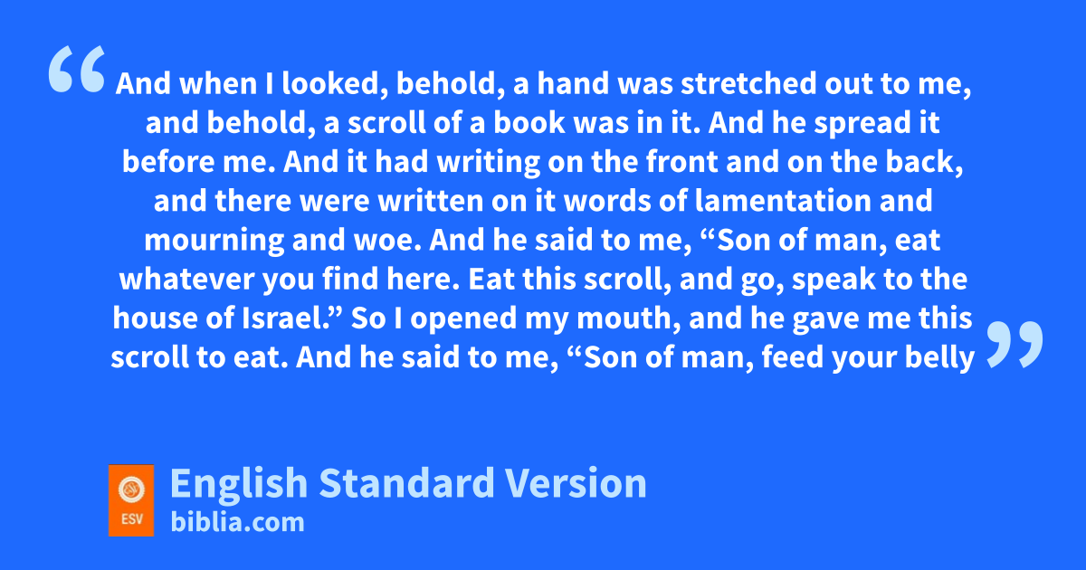 8 “But you, son of man, hear what I say to you. oBe not rebellious like that rebellious house; open your mouth and peat what I give you.” 9 And when I looked, behold, qa hand was stretched out to me, and behold, ra scroll of a book was in it. 10 And he spread it before me. And it had writing son the front and on the back, and there were written on it words of lamentation and mourning and woe.
