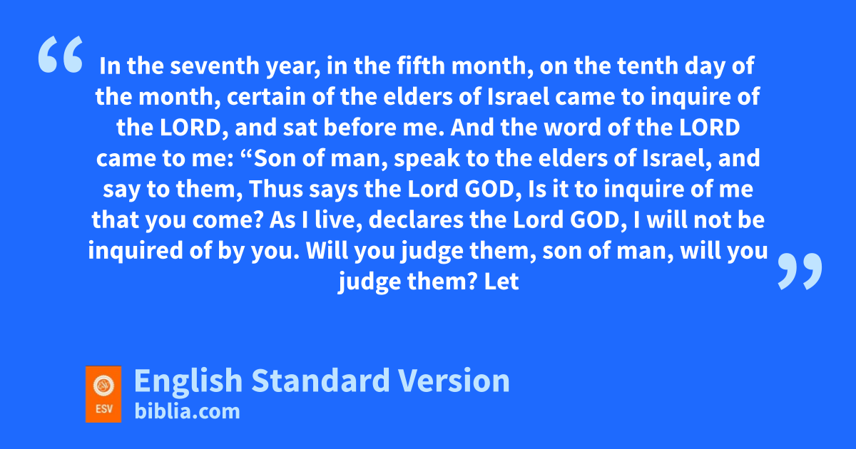 20 qIn the seventh year, in the fifth month, on the tenth day of the month, certain of rthe elders of Israel came to inquire of the Lord, sand sat before me. 2 And the word of the Lord came to me: 3 t“Son of man, speak to the elders of Israel, and say to them, Thus says the Lord God, Is it to inquire of me that you come? uAs I live, declares the Lord God, vI will not be inquired of by you. 4 wWill you judge them, son of man, will you judge them? xLet them know the abominations of their fathers, 5 and say to them, Thus says the Lord God: yOn the day when I chose Israel, zI swore1 to the offspring of the house of Jacob, amaking myself known to them in the land of Egypt; zI swore to them, saying, I am the Lord your God. 6 On that day I swore to them that bI would bring them out of the land of Egypt into a land that I had searched out for them, a land bflowing with milk and honey, cthe most glorious of all lands. 7 And I said to them, d‘Cast away the detestable things eyour eyes feast on, every one of you, and do not defile yourselves with fthe idols of Egypt; gI am the Lord your God.’ 8 hBut they rebelled against me and were not willing to listen to me. iNone of them cast away the detestable things their eyes feasted on, nor did they forsake the idols of Egypt.