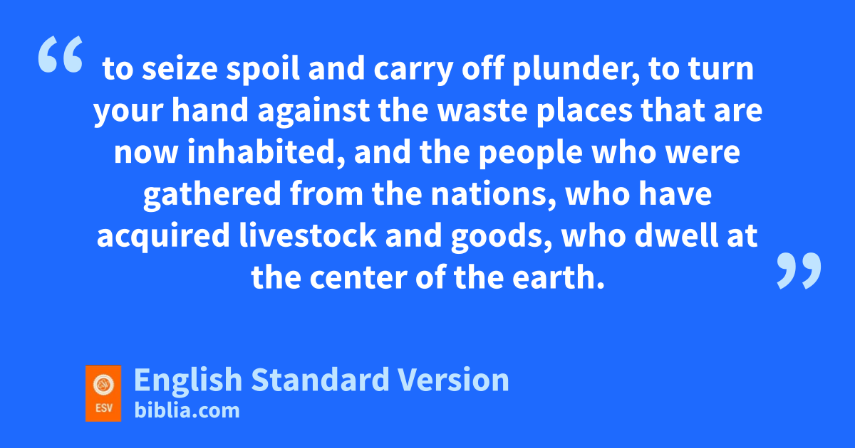 10 “Thus says the Lord God: On that day, jthoughts will come into your mind, and you will devise an evil scheme 11 and say, ‘I will go up against kthe land of unwalled villages. I will fall upon lthe quiet people who dwell securely, all of them dwelling without walls, and having no bars or gates,’ 12 to seize spoil and carry off plunder, to turn your hand against mthe waste places that are now inhabited, and mthe people who were gathered from the nations, who have acquired livestock and goods, nwho dwell at the center of the earth. 13 oSheba and pDedan and the merchants of Tarshish and all qits leaders3 will say to you, ‘Have you come to seize spoil? Have you assembled your hosts to carry off plunder, to carry away silver and gold, to take away livestock and goods, to seize great spoil?’