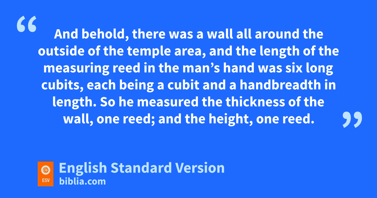 5 And behold, there was ja wall all around the outside of the temple area, and the length of the measuring reed in the man’s hand was six long cubits, keach being a cubit and a handbreadth2 in length. So he measured the thickness of the wall, one reed; and the height, one reed. 6 Then he went into lthe gateway facing east, mgoing up its steps, and measured the threshold of the gate, one reed deep.3 7 And nthe side rooms, one reed long and one reed broad; and the space between the side rooms, five cubits; and the threshold of the gate by the vestibule of the gate at the inner end, one reed. 8 Then he measured the vestibule of the gateway, on the inside, one reed. 9 Then he measured the vestibule of the gateway, eight cubits; oand its jambs, two cubits; and the vestibule of the gate was at the inner end. 10 And there were three side rooms on either side of the east gate. pThe three were of the same size, and the jambs on either side were of the same size. 11 Then he measured the width of the opening of the gateway, ten cubits; and the length of the gateway, thirteen cubits. 12 There was a barrier before the side rooms, one cubit on either side. And the side rooms were six cubits on either side. 13 Then he measured the gate from the ceiling of the one side room to the ceiling of the other, a breadth of twenty-five cubits; the openings faced each other. 14 He measured also qthe vestibule, sixty cubits. And around the vestibule of the gateway was the court.4 15 From the front of the gate at the entrance to the front of the inner vestibule of the gate was fifty cubits. 16 And the gateway had rwindows all around, narrowing inwards toward the side rooms and toward their sjambs, and likewise the vestibule had windows all around inside, and on the jambs were tpalm trees.