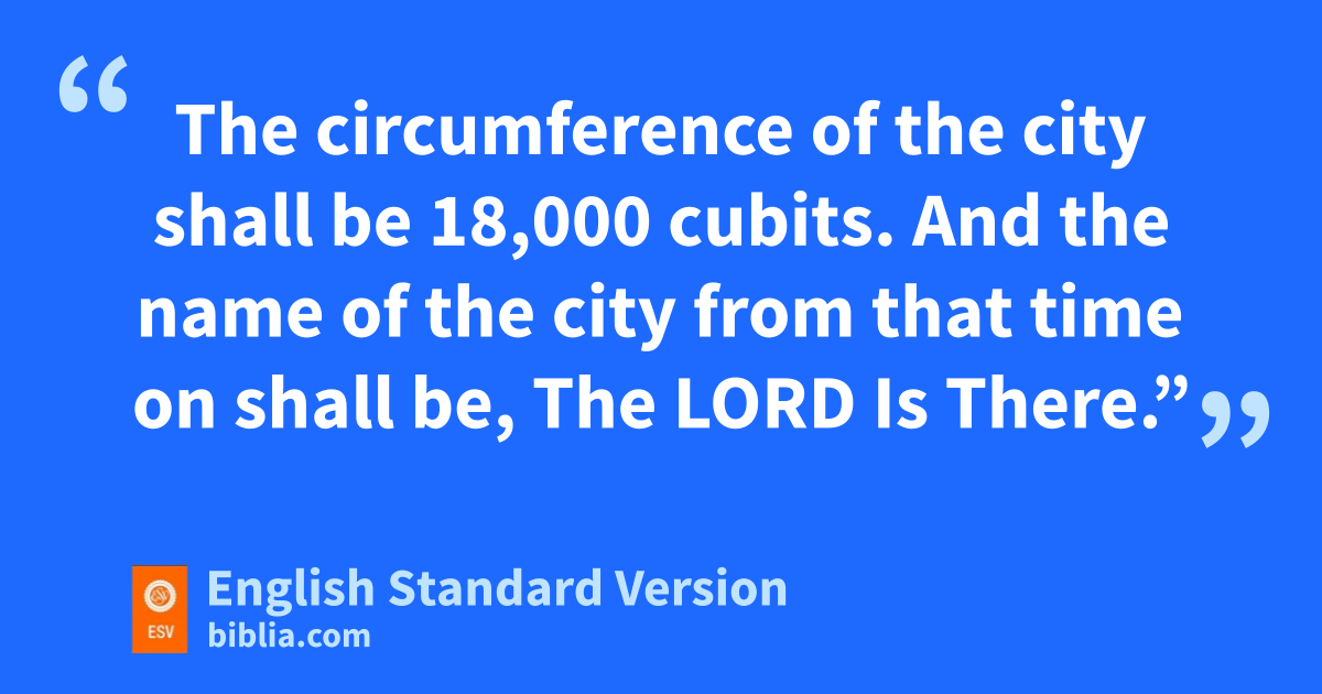 30 “These shall be jthe exits of the city: On the north side, which is to be k4,500 cubits by measure, 31 lthree gates, the gate of mReuben, the gate of mJudah, and the gate of mLevi, the gates of the city being named after the tribes of Israel. 32 On the east side, which is to be 4,500 cubits, three gates, the gate of Joseph, the gate of Benjamin, and the gate of Dan. 33 On the south side, which is to be 4,500 cubits by measure, three gates, the gate of Simeon, the gate of Issachar, and the gate of Zebulun. 34 On the west side, which is to be 4,500 cubits, three gates,8 the gate of Gad, the gate of Asher, and the gate of Naphtali. 35 The circumference of the city shall be 18,000 cubits. And nthe name of the city from that time on shall be, oThe Lord Is There.”