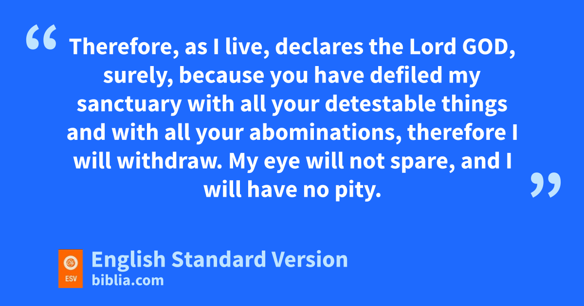 5 “Thus says the Lord God: lThis is Jerusalem. I have set her min the center of the nations, with countries all around her. 6 And she has rebelled against my rules by doing wickedness nmore than the nations, and against my statutes more than mthe countries all around her; for they have rejected my rules and have not walked in my statutes. 7 Therefore thus says the Lord God: Because you are omore turbulent than the nations that are all around you, pand have not walked in my statutes or obeyed my rules, qand have not1 even acted according to the rules of the nations that are all around you, 8 therefore thus says the Lord God: Behold, I, even I, ram against you. sAnd I will execute judgments2 in your midst tin the sight of the nations. 9 And because of all your abominations I will do with you uwhat I have never yet done, and the like of which I will never do again. 10 Therefore vfathers shall eat their sons in your midst, and sons shall eat their fathers. sAnd I will execute judgments on you, wand any of you who survive I will scatter to all the winds. 11 Therefore, xas I live, declares the Lord God, surely, ybecause you have defiled my sanctuary zwith all your detestable things and with all your aabominations, btherefore I will withdraw.3 cMy eye will not spare, and I will have no pity. 12 dA third part of you shall die of pestilence and be consumed with famine in your midst; da third part shall fall by the sword all around you; dand a third part I will scatter to all the winds and will unsheathe the sword after them.