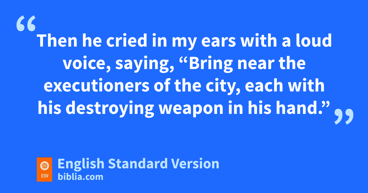 9 Then he cried in my ears with a loud voice, saying, “Bring near the executioners of the city, zeach with his destroying weapon in his hand.” 2 And behold, six men came from the direction of athe upper gate, which faces north, each with his weapon for slaughter in his hand, and with them was ba man clothed in linen, with a writing case at his waist. And they went in and stood beside cthe bronze altar.