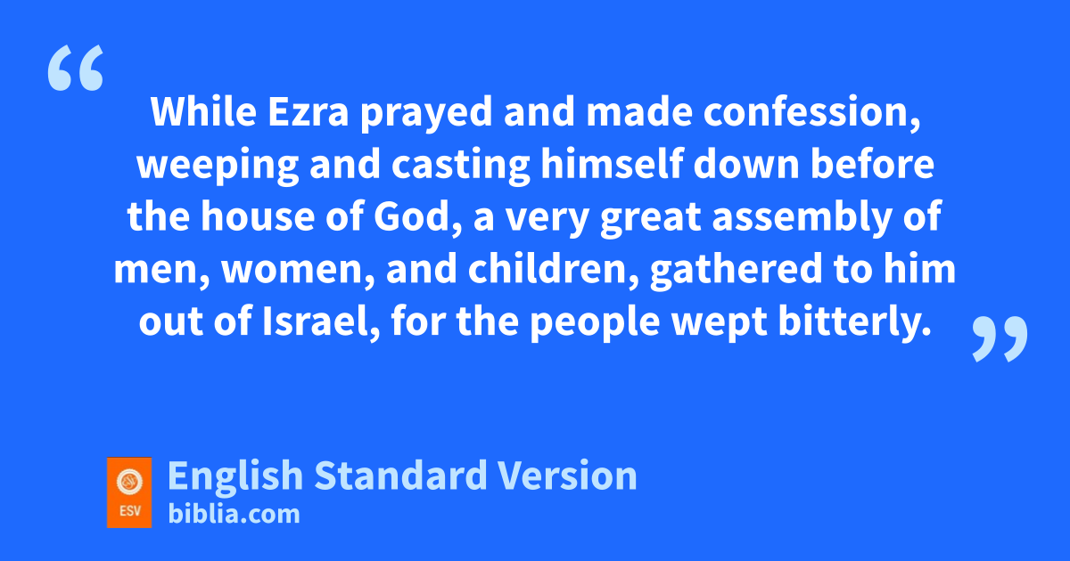 10 jWhile Ezra prayed and kmade confession, weeping and lcasting himself down mbefore the house of God, a very great assembly of men, women, and children, gathered to him out of Israel, for the people wept bitterly. 2 And Shecaniah the son of Jehiel, of the sons of Elam, addressed Ezra: n“We have broken faith with our God and have married foreign women from the peoples of the land, but even now there is hope for Israel in spite of this. 3 Therefore olet us make a covenant with our God to put away all these wives and ptheir children, according to the counsel of my lord1 and of qthose who tremble at the commandment of our God, and let it be done raccording to the Law. 4 Arise, for it is your task, and we are with you; sbe strong and do it.” 5 Then Ezra arose and made the leading priests and Levites and all Israel ttake an oath that they would do as had been said. So they took the oath.