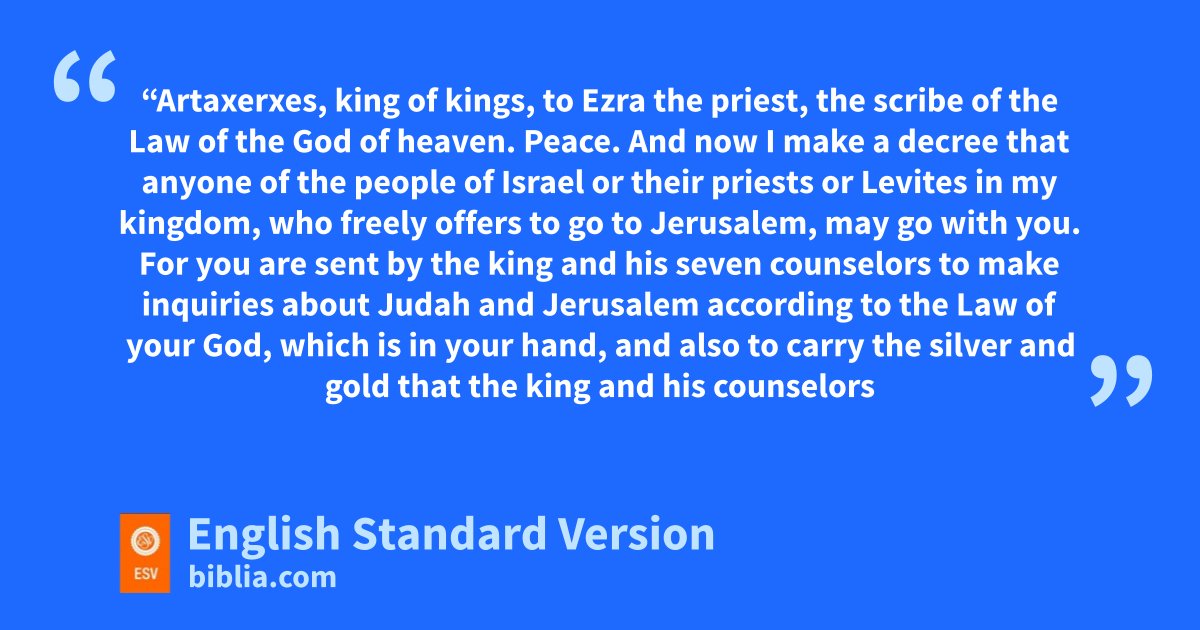 11 This is a copy of the letter that King Artaxerxes gave to Ezra the priest, the scribe, a man learned in matters of the commandments of the Lord and his statutes for Israel: 12 “Artaxerxes, fking of kings, to Ezra the priest, the gscribe of the Law of the God of heaven. Peace.2 hAnd now 13 iI make a decree that anyone of the people of Israel or their priests or Levites in my kingdom, who freely offers to go to Jerusalem, may go with you. 14 For you are sent by the king jand his seven counselors to make inquiries about Judah and Jerusalem according to the Law of your God, which is in your hand, 15 and also to carry the silver and gold that the king jand his counselors have freely offered to the God of Israel, kwhose dwelling is in Jerusalem, 16 lwith all the silver and gold that you shall find in the whole province of Babylonia, and mwith the freewill offerings of the people and the priests, vowed willingly for the house of their God that is in Jerusalem. 17 With this money, then, you shall with all diligence buy bulls, rams, and lambs, with their grain offerings and their drink offerings, and nyou shall offer them on the altar of the house of your God that is in Jerusalem. 18 Whatever seems good to you and your brothers to do with the rest of the silver and gold, you may do, according to the will of your God. 19 The vessels that have been given you for the service of the house of your God, you shall deliver before the God of Jerusalem. 20 And whatever else is required for the house of your God, which it falls to you to provide, you may provide it out of the king’s treasury.