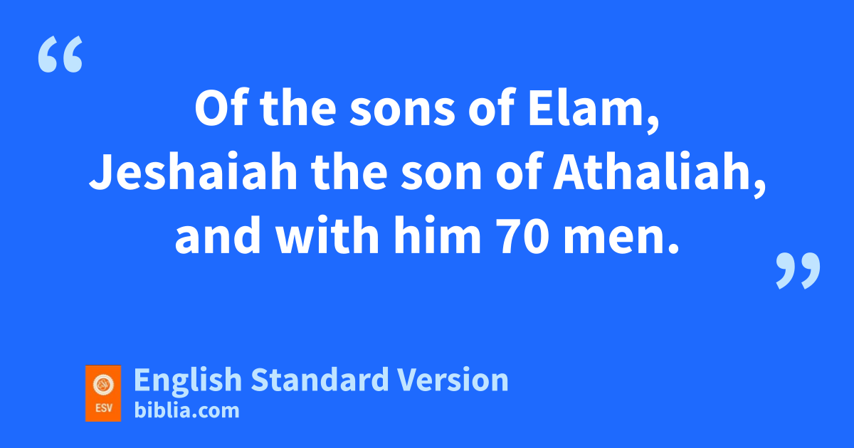 8 These are the heads of their fathers’ houses, and this is the genealogy of those who went up with me from Babylonia, in the reign of Artaxerxes the king: 2 Of the sons of Phinehas, Gershom. Of the sons of uIthamar, Daniel. Of the sons of David, vHattush. 3 Of the sons of Shecaniah, who was of the sons of wParosh, Zechariah, with whom were registered 150 men. 4 xOf the sons of Pahath-moab, Eliehoenai the son of Zerahiah, and with him 200 men. 5 Of the sons of Zattu,1 Shecaniah the son of Jahaziel, and with him 300 men. 6 Of the sons of Adin, Ebed the son of Jonathan, and with him 50 men. 7 Of the sons of Elam, Jeshaiah the son of Athaliah, and with him 70 men. 8 Of the sons of Shephatiah, Zebadiah the son of Michael, and with him 80 men. 9 Of the sons of Joab, Obadiah the son of Jehiel, and with him 218 men. 10 Of the sons of Bani,2 Shelomith the son of Josiphiah, and with him 160 men. 11 yOf the sons of Bebai, Zechariah, the son of Bebai, and with him 28 men. 12 Of the sons of Azgad, Johanan the son of Hakkatan, and with him 110 men. 13 Of the sons of Adonikam, those who came later, their names being Eliphelet, Jeuel, and Shemaiah, and with them 60 men. 14 Of the sons of Bigvai, Uthai and Zaccur, and with them 70 men.