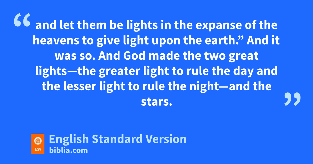 14 And God said, “Let there be lights in the expanse of the heavens to separate the day from the night. And let them be for isigns and for jseasons,6 and for days and years, 15 and let them be lights in the expanse of the heavens to give light upon the earth.” And it was so. 16 And God kmade the two great lights—the greater light to rule the day and the lesser light to rule the night—and the stars. 17 And God set them in the expanse of the heavens to give light on the earth, 18 to lrule over the day and over the night, and to separate the light from the darkness. And God saw that it was good. 19 And there was evening and there was morning, the fourth day.