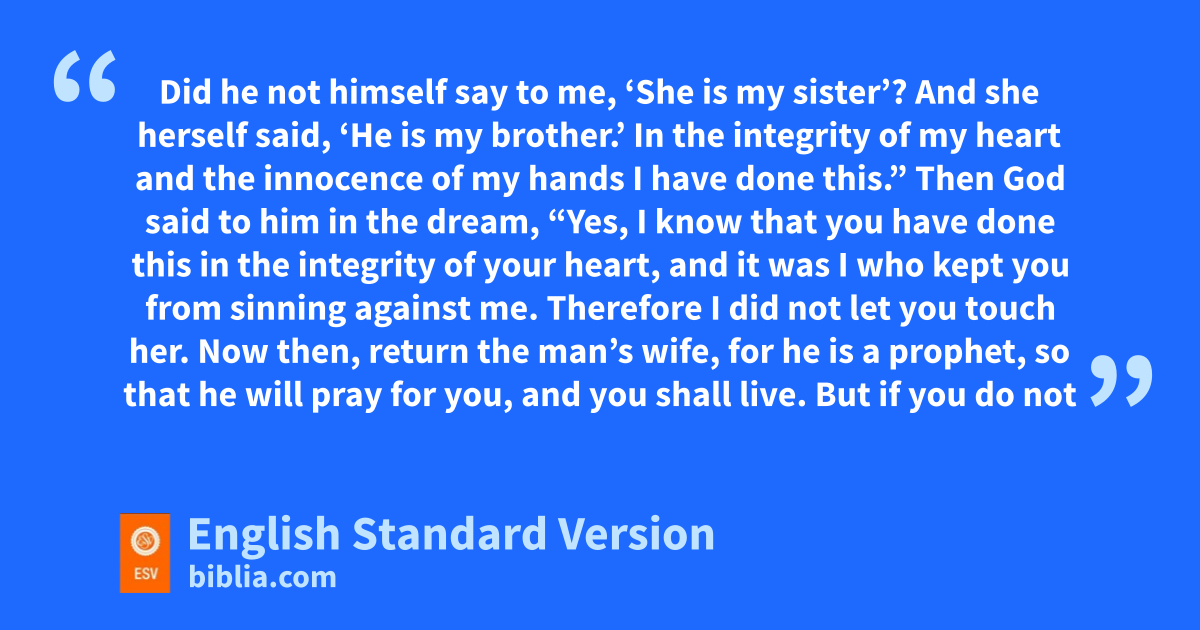20 From there Abraham journeyed toward the territory of the Negeb and lived between pKadesh and Shur; and he qsojourned in rGerar. 2 And Abraham said of Sarah his wife, s“She is my sister.” And Abimelech king of Gerar sent and took Sarah. 3 tBut God came to Abimelech uin a dream by night and said to him, “Behold, you are a dead man because of the woman whom you have taken, for she is a man’s wife.” 4 Now Abimelech had not approached her. So he said, v“Lord, will you kill an innocent people? 5 Did he not himself say to me, ‘She is my sister’? And she herself said, ‘He is my brother.’ In the integrity of my heart and the innocence of my hands I have done this.” 6 Then God said to him in the dream, “Yes, I know that you have done this in the integrity of your heart, and it was I who kept you from sinning wagainst me. Therefore I did not let you touch her. 7 Now then, return the man’s wife, xfor he is a prophet, so that he will pray for you, and you shall live. But if you do not return her, know that you shall surely die, you yand all who are yours.”
