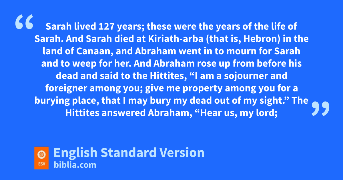 23 Sarah lived 127 years; these were the years of the life of Sarah. 2 And Sarah died at dKiriath-arba (that is, eHebron) in the land of Canaan, and Abraham went in to mourn for Sarah and to weep for her. 3 And Abraham rose up from before his dead and said to the Hittites,1 4 f“I am a sojourner and foreigner among you; ggive me property among you for a burying place, that I may bury my dead out of my sight.” 5 The Hittites answered Abraham, 6 “Hear us, my lord; you are a prince of God2 among us. Bury your dead in the choicest of our tombs. None of us will withhold from you his tomb to hinder you from burying your dead.” 7 Abraham rose and bowed to the Hittites, the people of the land. 8 And he said to them, “If you are willing that I should bury my dead out of my sight, hear me and entreat for me Ephron the son of Zohar, 9 that he may give me the cave of Machpelah, which he owns; it is at the end of his field. For the full price let him give it to me in your presence as property for a burying place.”