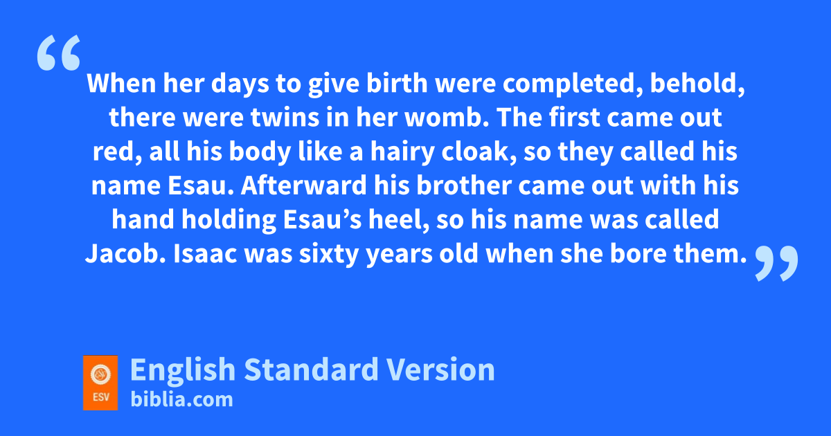 24 When her days to give birth were completed, behold, there were twins in her womb. 25 The first came out red, nall his body like a hairy cloak, so they called his name Esau. 26 Afterward his brother came out with ohis hand holding Esau’s heel, so phis name was called Jacob.4 Isaac was sixty years old when she bore them.