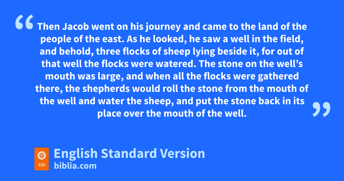 29 Then Jacob went on his journey and came to kthe land of the people of the east. 2 As he looked, he saw a well in the field, and behold, three flocks of sheep lying beside it, for out of that well the flocks were watered. The stone on the well’s mouth was large, 3 and when all the flocks were gathered there, the shepherds would roll the stone from the mouth of the well and water the sheep, and put the stone back in its place over the mouth of the well.