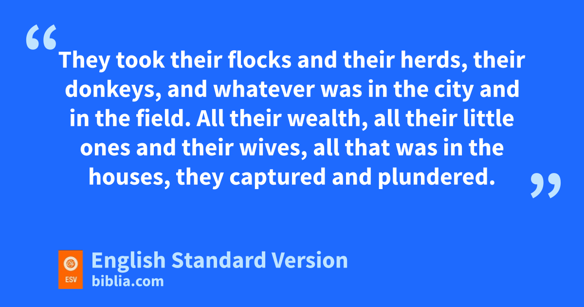 25 On the third day, when they were sore, two of the sons of Jacob, vSimeon and Levi, wDinah’s brothers, took their swords and came against the city while it felt secure and killed all the males. 26 They killed Hamor and his son Shechem with the sword and took Dinah out of Shechem’s house and went away. 27 The sons of Jacob came upon the slain and plundered the city, because they had defiled their sister. 28 They took their flocks and their herds, their donkeys, and whatever was in the city and in the field. 29 All their wealth, all their little ones and their wives, all that was in the houses, they captured and plundered.