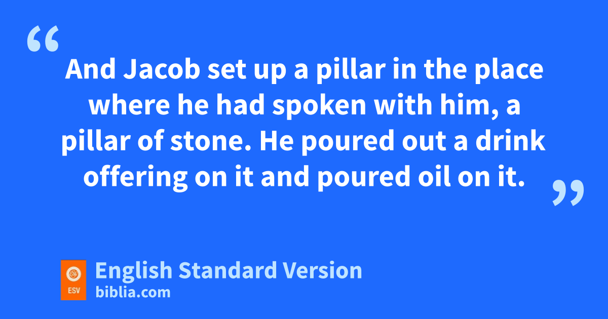 9 God appeared3 to Jacob again, when he came from Paddan-aram, and blessed him. 10 And God said to him, “Your name is Jacob; mno longer shall your name be called Jacob, but nIsrael shall be your name.” So he called his name Israel. 11 And God said to him, o“I am God Almighty:4 be pfruitful and multiply. qA nation and a company of nations shall come from you, and kings shall come from your own body.5 12 rThe land that I gave to Abraham and Isaac I will give to you, and I will give the land to your offspring after you.” 13 Then God swent up from him in the place where he had spoken with him. 14 And Jacob tset up a pillar in the place where he had spoken with him, a pillar of stone. He poured out a drink offering on it and poured oil on it. 15 So Jacob called the name of the place where God had spoken with him uBethel.