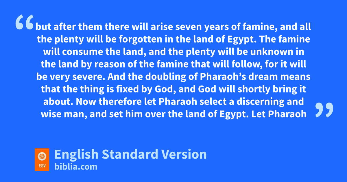 25 Then Joseph said to Pharaoh, “The dreams of Pharaoh are one; mGod has revealed to Pharaoh what he is about to do. 26 The seven good cows are seven years, and the seven good ears are seven years; the dreams are one. 27 The seven lean and ugly cows that came up after them are seven years, and the seven empty ears blighted by the east wind are also nseven years of famine. 28 It is as I told Pharaoh; oGod has shown to Pharaoh what he is about to do. 29 There will come pseven years of great plenty throughout all the land of Egypt, 30 but after them there will arise qseven years of famine, and all the plenty will be forgotten in the land of Egypt. rThe famine will consume the land, 31 and the plenty will be unknown in the land by reason of the famine that will follow, for it will be very severe. 32 And the doubling of Pharaoh’s dream means that the sthing is fixed by God, and God will shortly bring it about. 33 Now therefore let Pharaoh select a discerning and wise man, and set him over the land of Egypt. 34 Let Pharaoh proceed to appoint overseers over the land and take one-fifth of the produce of the land2 of Egypt during the seven plentiful years. 35 And tlet them gather all the food of these good years that are coming and store up grain under the authority of Pharaoh for food in the cities, and let them keep it. 36 That food shall be a reserve for the land against the seven years of famine that are to occur in the land of Egypt, so that the land may not perish through the famine.”