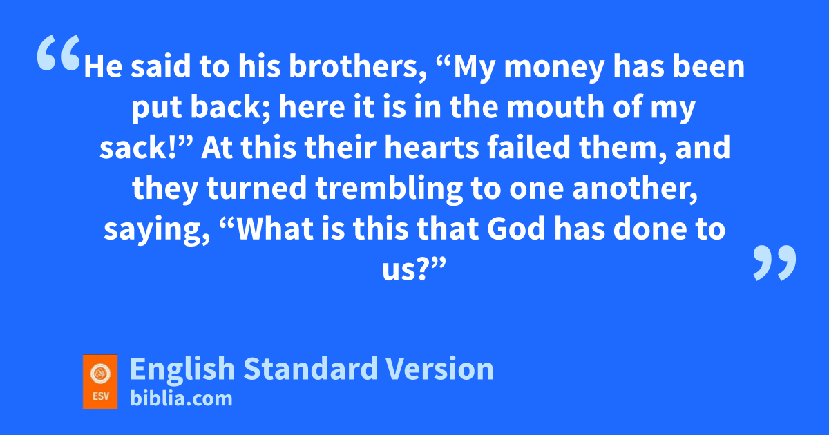 26 Then they loaded their donkeys with their grain and departed. 27 And as done of them opened his sack to give his donkey fodder at ethe lodging place, he saw his money in the mouth of his sack. 28 He said to his brothers, “My money has been put back; here it is in the mouth of my sack!” At this their hearts failed them, and they turned trembling to one another, saying, “What is this that God has done to us?”