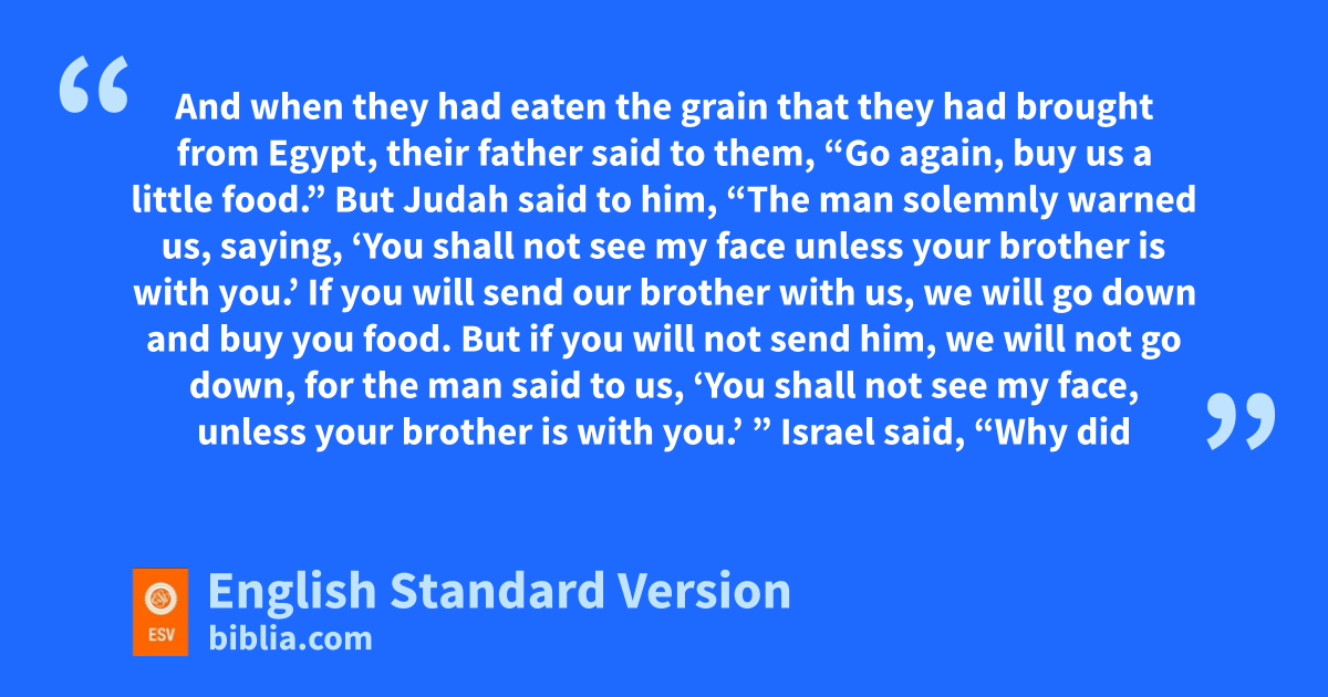 43 Now the famine was qsevere in the land. 2 And when they had eaten the grain that they had brought from Egypt, their father said to them, “Go again, buy us a little food.” 3 But Judah said to him, “The man solemnly warned us, saying, ‘You shall not see my face unless your rbrother is with you.’ 4 If you will send our brother with us, we will go down and buy you food. 5 But if you will not send him, we will not go down, for the man said to us, ‘You shall not see my face, unless your brother is with you.’ ” 6 Israel said, “Why did you treat me so badly as to tell the man that you had another brother?” 7 They replied, “The man questioned us carefully about ourselves and our kindred, saying, ‘Is your father still alive? Do you have another brother?’ What we told him was in answer to these questions. Could we in any way know that he would say, ‘Bring your brother down’?” 8 And Judah said to Israel his father, “Send the boy with me, and we will arise and go, that we may slive and not die, both we and you and also our little ones. 9 I will be a pledge of his safety. From my hand you shall require him. tIf I do not bring him back to you and set him before you, then let me bear the blame forever. 10 If we had not delayed, we would now have returned twice.”