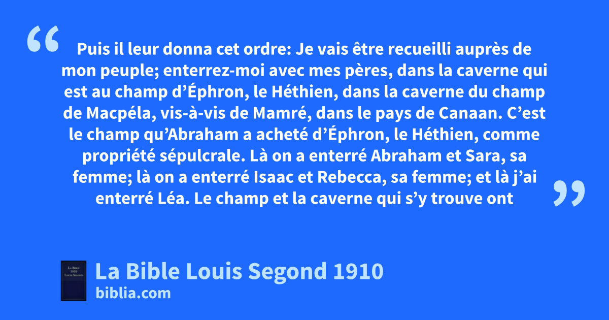 29Puis il leur donna cet ordre: Je vais être recueilli auprès de mon peuple; enterrez-moi avec mes pères, dans la caverne qui est au champ d’Éphron, le Héthien, 30dans la caverne jdu champ de Macpéla, vis-à-vis de Mamré, dans le pays de Canaan. C’est le champ qu’Abraham a acheté d’Éphron, le Héthien, comme propriété sépulcrale. 31Là on a enterré kAbraham et Sara, sa femme; là on a enterré Isaac et Rebecca, sa femme; et là j’ai enterré Léa. 32Le champ et la caverne qui s’y trouve ont été achetés des fils de Heth. 33Lorsque Jacob eut achevé de donner ses ordres à ses fils, lil retira ses pieds dans le lit, il expira, et fut recueilli auprès de son peuple.