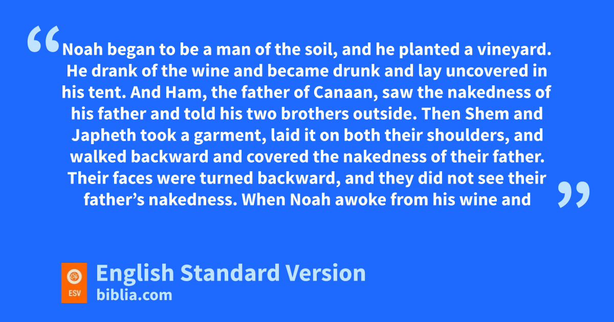 20 Noah began to be a man of the soil, and he planted a vineyard.3 21 He drank of the wine and became drunk and lay uncovered in his tent. 22 And Ham, the father of Canaan, saw the nakedness of his father and told his two brothers outside. 23 Then Shem and Japheth took a garment, laid it on both their shoulders, and walked backward and covered the nakedness of their father. Their faces were turned backward, and they did not see their father’s nakedness. 24 When Noah awoke from his wine hand knew what his youngest son had done to him, 25 he said,