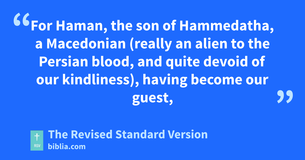 7 “What has been wickedly accomplished through the pestilent behavior of those who exercise authority unworthily, can be seen not so much from the more ancient records which we hand on as from investigation of matters close at hand. 8 For the future we will take care to render our kingdom quiet and peaceable for all men, 9 by changing our methods and always judging what comes before our eyes with more equitable consideration. 10 For Haman, the son of Hammedatha, a Macedonian (really an alien to the Persian blood, and quite devoid of our kindliness), having become our guest, 11 so far enjoyed the good will that we have for every nation that he was called our father and was continually bowed down to by all as the person second to the royal throne. 12 But, unable to restrain his arrogance, he undertook to deprive us of our kingdom and our life, 13 and with intricate craft and deceit asked for the destruction of Mordecai, our savior and perpetual benefactor, and of Esther, the blameless partner of our kingdom, together with their whole nation. 14 He thought that in this way he would find us undefended and would transfer the kingdom of the Persians to the Macedonians.
