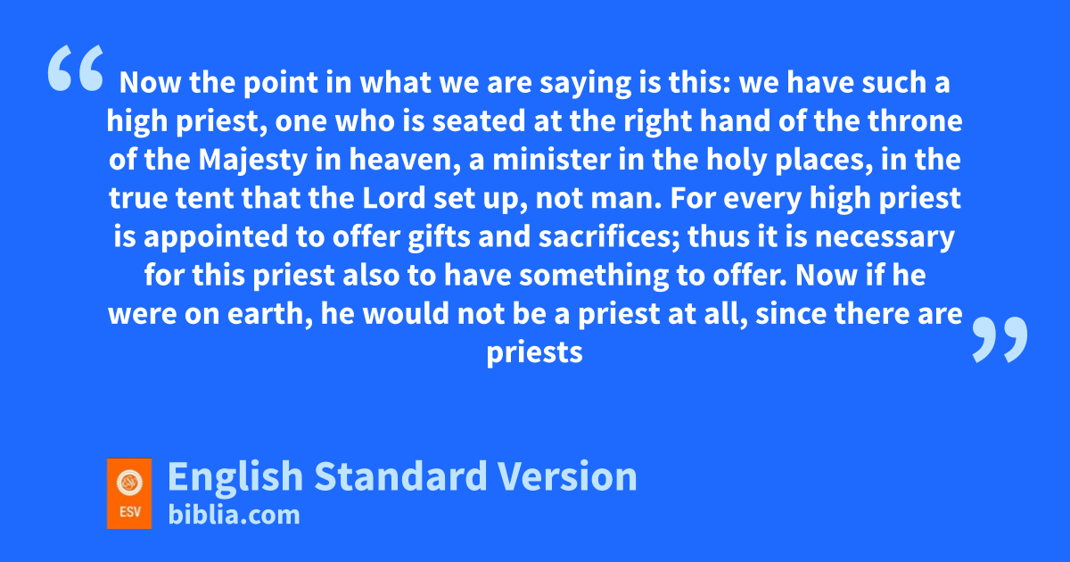 8 Now the point in what we are saying is this: we have such a high priest, uone who is seated at the right hand of the throne of the Majesty in heaven, 2 a minister in the holy places, in vthe true tent1 that the Lord wset up, not man. 3 For xevery high priest is appointed to offer gifts and sacrifices; thus yit is necessary for this priest also to have something to offer. 4 Now if he were on earth, he would not be a priest at all, since there are priests who offer gifts according to the law. 5 They serve za copy and ashadow of the heavenly things. For when Moses was about to erect the tent, he was instructed by God, saying, b“See that you make everything according to the pattern that was shown you on the mountain.” 6 But as it is, Christ2 has obtained a ministry that is cas much more excellent than the old as dthe covenant ehe mediates is better, since it is enacted on better promises. 7 fFor if that first covenant had been faultless, there would have been no occasion to look for a second.