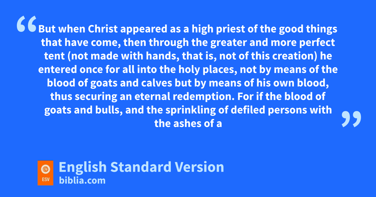 11 But when Christ appeared as a high priest gof the good things that have come,5 then through hthe greater and more perfect tent (inot made with hands, that is, not of this creation) 12 he jentered konce for all into the holy places, not by means of lthe blood of goats and calves but mby means of his own blood, nthus securing an eternal redemption. 13 For if othe blood of goats and bulls, and the sprinkling of defiled persons with pthe ashes of a heifer, sanctify6 for the purification of the flesh, 14 how much more will qthe blood of Christ, who through the eternal Spirit roffered himself without blemish to God, spurify our7 conscience tfrom dead works uto serve the living God.