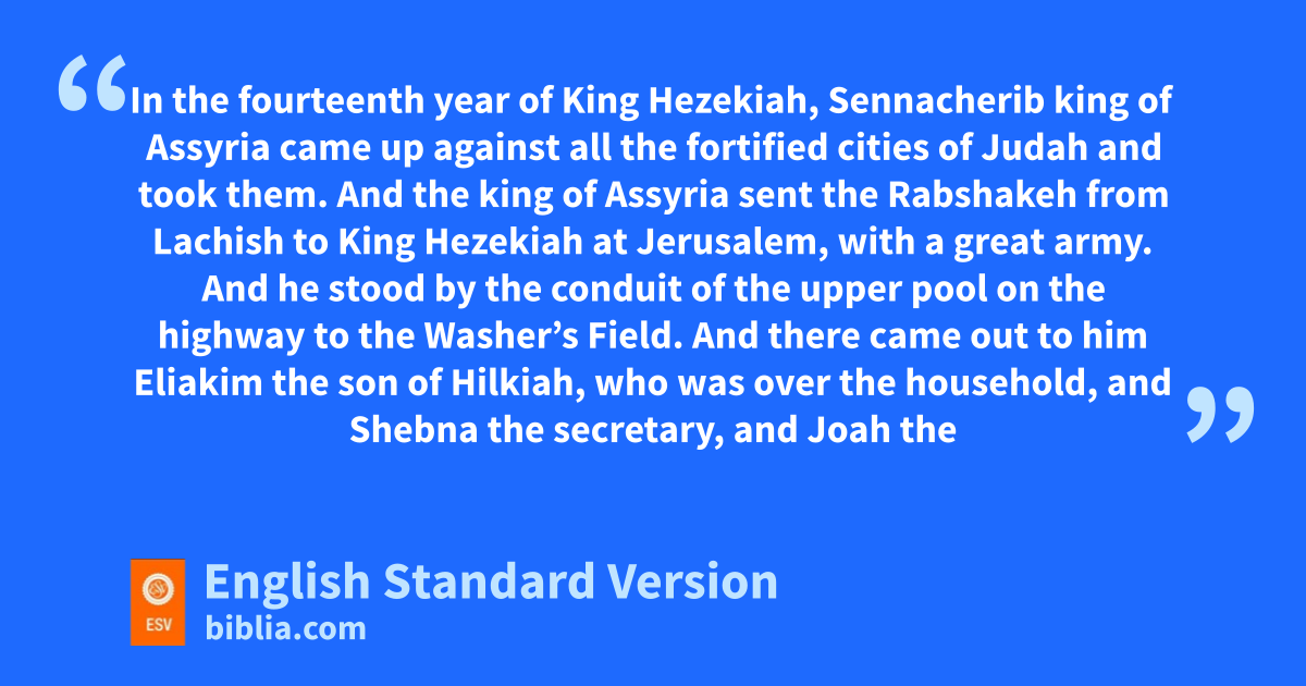 36 jIn the fourteenth year of King Hezekiah, kSennacherib king of Assyria came up against all the fortified cities of Judah and took them. 2 lAnd the king of Assyria sent the Rabshakeh1 from mLachish to King Hezekiah at Jerusalem, with a great army. And he stood nby the conduit of the upper pool on the highway to the Washer’s Field. 3 And there came out to him oEliakim the son of Hilkiah, who was over the household, and oShebna the secretary, and Joah the son of Asaph, the recorder.