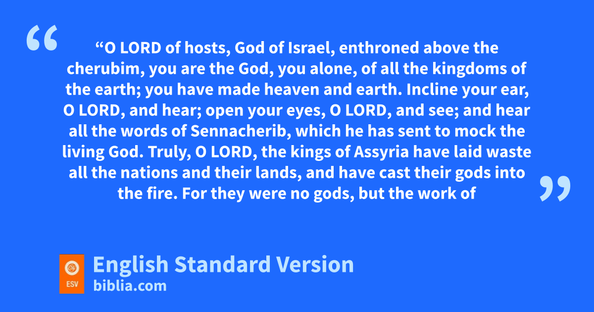 14 Hezekiah received the letter from the hand of the messengers, and read it; and Hezekiah went up to the house of the Lord, and spread it before the Lord. 15 And Hezekiah prayed to the Lord: 16 “O Lord of hosts, God of Israel, senthroned above the cherubim, you are the God, you alone, of all the kingdoms of the earth; tyou have made heaven and earth. 17 uIncline your ear, O Lord, and hear; open your eyes, O Lord, and see; and hear vall the words of Sennacherib, which he has sent to mock the living God. 18 Truly, O Lord, wthe kings of Assyria have laid waste all the nations and their lands, 19 and have cast their gods into the fire. For they were no gods, but the work of men’s hands, wood and stone. Therefore they were destroyed. 20 So now, O Lord our God, save us from his hand, that all the kingdoms of the earth may know that you alone are the Lord.”