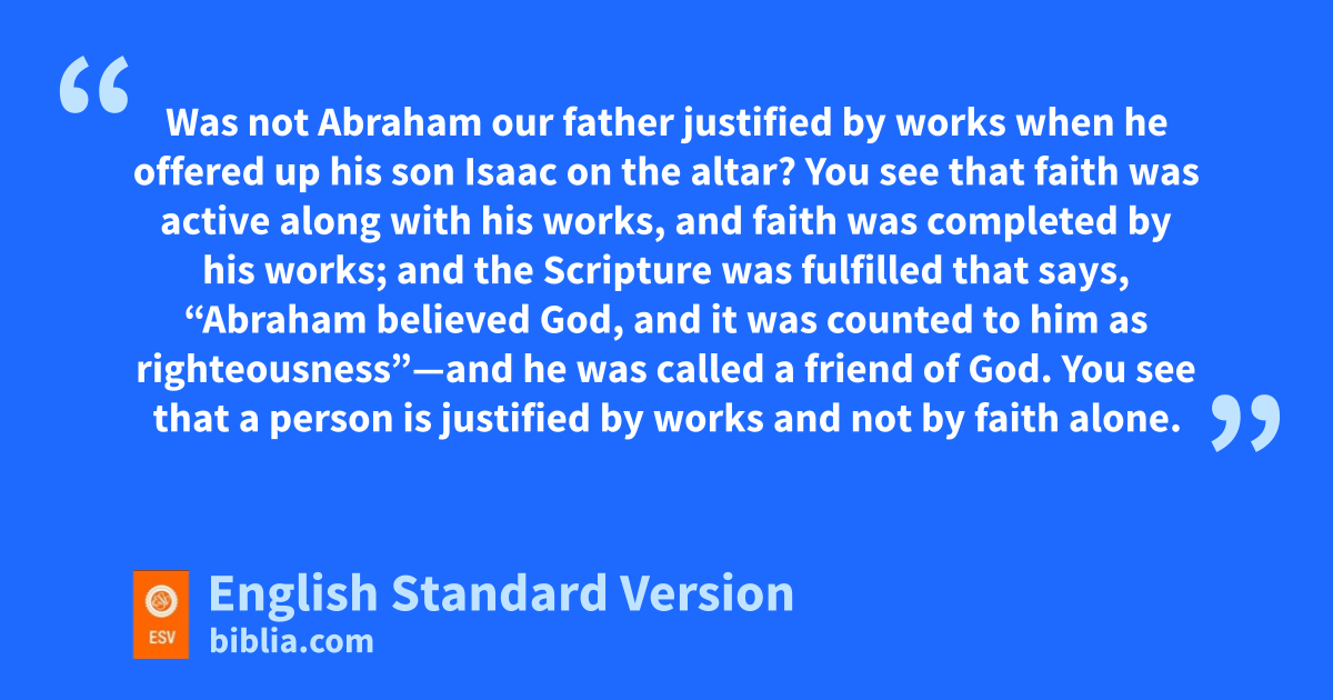 18 But someone will say, “You have faith and I have works.” Show me your faith rapart from your works, and I will show you my faith sby my works. 19 tYou believe that God is one; you do well. Even uthe demons believe—and shudder! 20 Do you want to be shown, you foolish person, that faith apart from works is useless? 21 vWas not Abraham our father justified by works when he offered up his son Isaac on the altar? 22 You see that wfaith was active along with his works, and faith was completed xby his works; 23 and the Scripture was fulfilled that says, y“Abraham believed God, and it was counted to him as righteousness”—and he was called a zfriend of God. 24 You see that a person is justified by works and not by faith alone. 25 And in the same way was not also aRahab the prostitute justified by works bwhen she received the messengers and sent them out by another way? 26 For as the body apart from the spirit is dead, so also faith apart from works is dead.