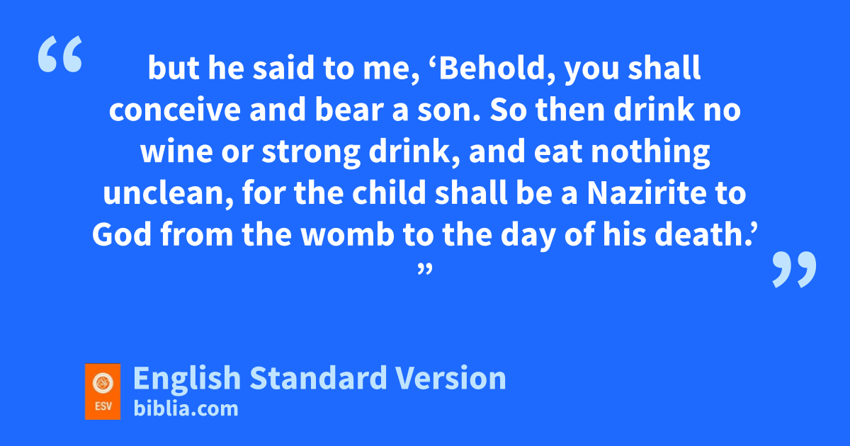 2 There was a certain man of wZorah, of the tribe of the Danites, whose name was Manoah. xAnd his wife was barren and had no children. 3 yAnd the angel of the Lord appeared to the woman and said to her, “Behold, you are barren and have not borne children, but you shall conceive and bear a son. 4 Therefore be careful zand drink no wine or strong drink, and eat nothing unclean, 5 for behold, you shall conceive and bear a son. aNo razor shall come upon his head, for the child shall be za Nazirite to God from the womb, and he shall bbegin to save Israel from the hand of the Philistines.” 6 Then the woman came and told her husband, c“A man of God came to me, and his appearance was like the appearance of the angel of God, very awesome. dI did not ask him where he was from, and he did not tell me his name, 7 but he said to me, e‘Behold, you shall conceive and bear a son. So then drink no wine or strong drink, and eat nothing unclean, for the child shall be a Nazirite to God from the womb to the day of his death.’ ”