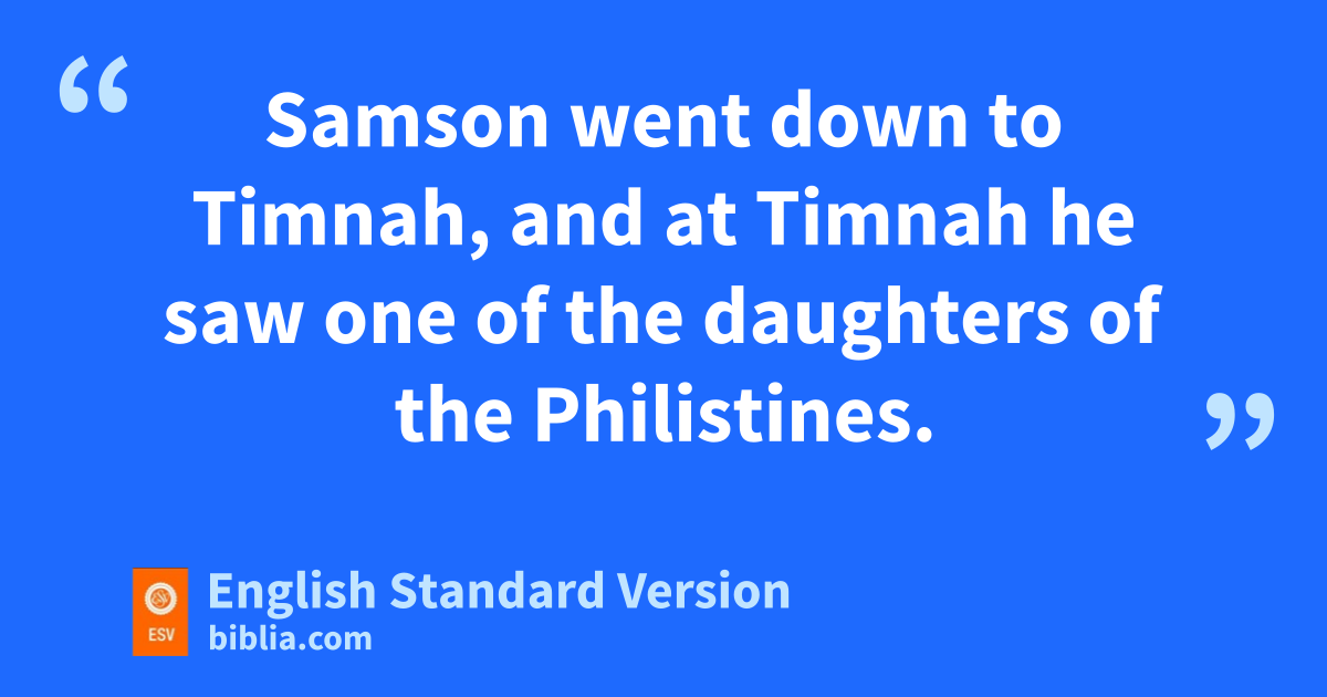 14 rSamson went down to sTimnah, and at Timnah he saw one of the daughters of the Philistines. 2 Then he came up and told his father and mother, “I saw one of the daughters of the Philistines at Timnah. tNow get her for me as my wife.” 3 But his father and mother said to him, “Is there not a woman among the daughters uof your relatives, or among all our people, that you must go to take a wife from the vuncircumcised Philistines?” But Samson said to his father, “Get her for me, for she is right in my eyes.”
