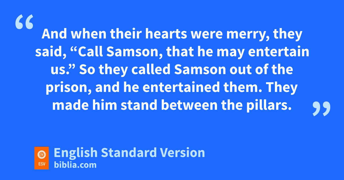 23 Now the lords of the Philistines gathered to offer a great sacrifice to nDagon their god and to rejoice, and they said, “Our god has given Samson our enemy into our hand.” 24 And when the people saw him, othey praised their god. For they said, “Our god has given our enemy into our hand, the ravager of our country, who has killed many of us.”2 25 And pwhen their hearts were merry, they said, “Call Samson, that he may entertain us.” So they called Samson out of the prison, and he entertained them. They made him stand between the pillars. 26 And Samson said to the young man who held him by the hand, “Let me feel the pillars on which the house rests, that I may lean against them.” 27 Now the house was full of men and women. All the lords of the Philistines were there, and qon the roof there were about 3,000 men and women, who looked on while Samson entertained.