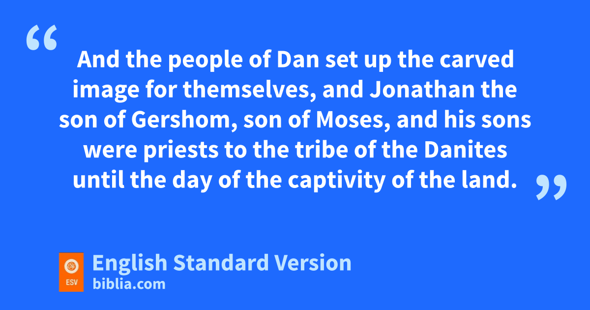 27 But the people of Dan took what Micah had made, and the priest who belonged to him, and they came to Laish, to a people nquiet and unsuspecting, and ostruck them with the edge of the sword and burned the city with fire. 28 And there was no deliverer because it was pfar from Sidon, and they had no dealings with anyone. It was in the valley that belongs to qBeth-rehob. Then they rebuilt the city and lived in it. 29 And they named the city rDan, after the name of Dan their ancestor, who was born to Israel; but sthe name of the city was Laish at the first. 30 And the people of Dan set up the carved image for themselves, and Jonathan the son of Gershom, tson of Moses,3 uand his sons were priests to the tribe of the Danites until the day vof the captivity of the land. 31 So they set up Micah’s carved image that he made, was long as the house of God was at Shiloh.
