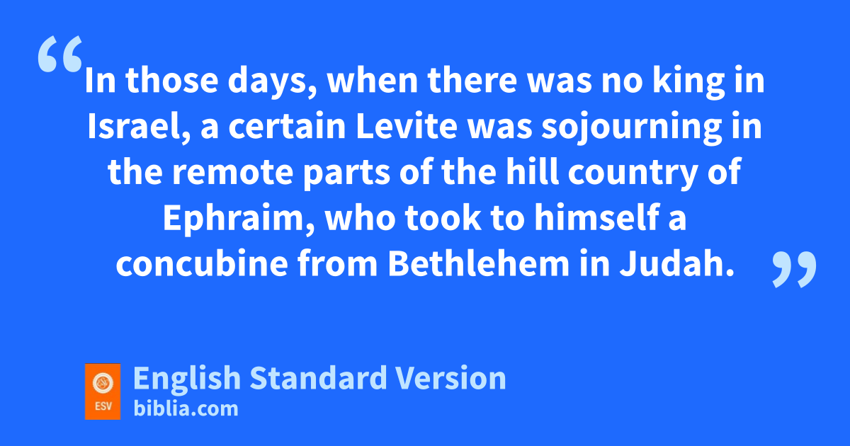 19 In those days, xwhen there was no king in Israel, a certain Levite was sojourning in the remote parts of ythe hill country of Ephraim, who took to himself a concubine from zBethlehem in Judah. 2 And his concubine was unfaithful to1 him, and she went away from him to her father’s house at Bethlehem in Judah, and was there some four months. 3 Then her husband arose and went after her, to speak kindly to her and bring her back. He had with him his servant and a couple of donkeys. And she brought him into her father’s house. And when the girl’s father saw him, he came with joy to meet him. 4 And his father-in-law, the girl’s father, made him stay, and he remained with him three days. So they ate and drank and spent the night there. 5 And on the fourth day they arose early in the morning, and he prepared to go, but the girl’s father said to his son-in-law, a“Strengthen your heart with a morsel of bread, and after that you may go.” 6 So the two of them sat and ate and drank together. And the girl’s father said to the man, “Be pleased to spend the night, and blet your heart be merry.” 7 And when the man rose up to go, his father-in-law pressed him, till he spent the night there again. 8 And on the fifth day he arose early in the morning to depart. And the girl’s father said, c“Strengthen your heart and wait until the day declines.” So they ate, both of them. 9 And when the man and his concubine and his servant rose up to depart, his father-in-law, the girl’s father, said to him, “Behold, now the day has waned toward evening. Please, spend the night. Behold, the day draws to its close. Lodge here and let your heart be merry, and tomorrow you shall arise early in the morning for your journey, and go home.”