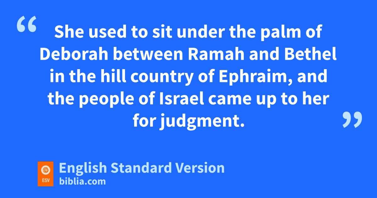4 Now Deborah, a prophetess, the wife of Lappidoth, was judging Israel at that time. 5 She used to sit under the palm of Deborah between Ramah and Bethel in ethe hill country of Ephraim, and the people of Israel came up to her for judgment. 6 She sent and summoned fBarak the son of Abinoam from gKedesh-naphtali and said to him, “Has not the Lord, the God of Israel, commanded you, ‘Go, gather your men at Mount hTabor, taking 10,000 from the people of Naphtali and the people of Zebulun. 7 And I will draw out Sisera, the general of Jabin’s army, to meet you by ithe river Kishon with his chariots and his troops, jand I will give him into your hand’?” 8 Barak said to her, “If you will go with me, I will go, but if you will not go with me, I will not go.” 9 And she said, “I will surely go with you. Nevertheless, the road on which you are going will not lead to your glory, for the Lord will ksell Sisera into the hand of a woman.” Then Deborah arose and went with Barak to Kedesh. 10 And Barak called out lZebulun and Naphtali to Kedesh. And 10,000 men went up at his heels, and Deborah went up with him.