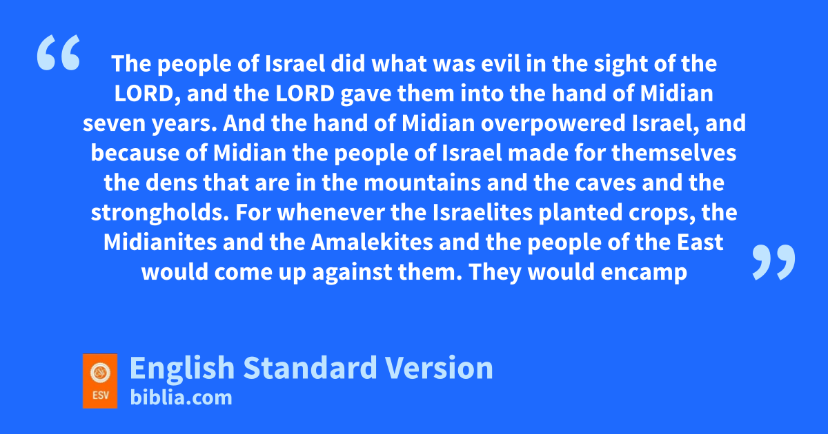 6 kThe people of Israel did what was evil in the sight of the Lord, and the Lord gave them into the hand of lMidian seven years. 2 And the hand of Midian overpowered Israel, and because of Midian the people of Israel made for themselves the dens that are in the mountains and mthe caves and the strongholds. 3 For whenever the Israelites planted crops, the Midianites and nthe Amalekites and othe people of the East would come up against them. 4 They would encamp against them pand devour the produce of the land, as far as Gaza, and leave no sustenance in Israel and no sheep or ox or donkey. 5 For they would come up with their livestock and their tents; they would come qlike locusts in number—both they and their camels could not be counted—so that they laid waste the land as they came in. 6 And Israel was brought very low because of Midian. And the people of Israel rcried out for help to the Lord.