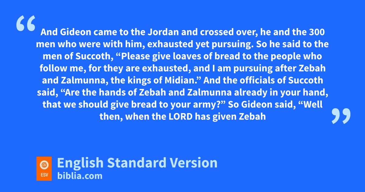 4 And Gideon came to the Jordan and crossed over, he and dthe 300 men who were with him, exhausted yet pursuing. 5 So he said to the men of eSuccoth, “Please give loaves of bread to the people who follow me, for they are exhausted, and I am pursuing after Zebah and Zalmunna, the kings of Midian.” 6 And the officials of Succoth said, f“Are the hands of Zebah and Zalmunna already in your hand, gthat we should give bread to your army?” 7 So Gideon said, “Well then, when the Lord has given Zebah and Zalmunna into my hand, hI will flail your flesh with the thorns of the wilderness and with briers.” 8 And from there he went up to iPenuel, and spoke to them in the same way, and the men of Penuel answered him as the men of Succoth had answered. 9 And he said to the men of Penuel, j“When I come again in peace, kI will break down this tower.”