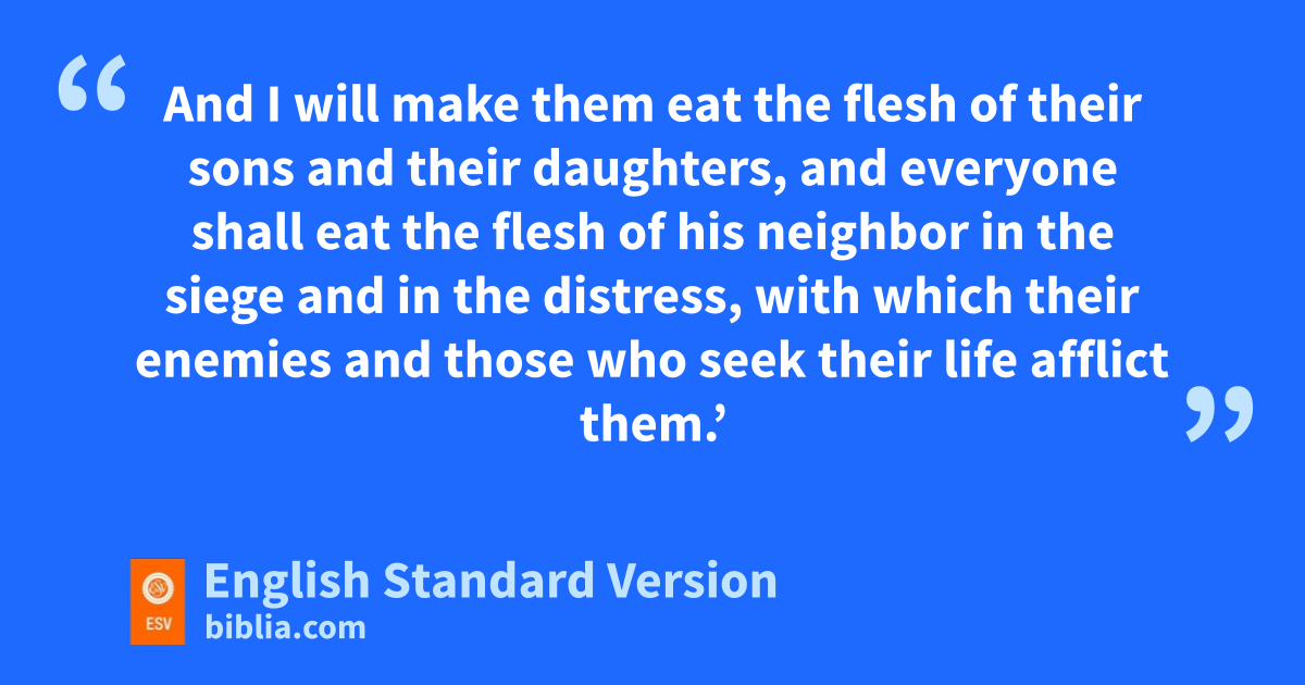 19 Thus says the Lord, “Go, buy ca potter’s earthenware dflask, and take some of ethe elders of the people and some of ethe elders of the priests, 2 and go out fto the Valley of the Son of Hinnom at the entry of the Potsherd Gate, and proclaim there the words that I tell you. 3 You shall say, g‘Hear the word of the Lord, hO kings of Judah and inhabitants of Jerusalem. Thus says the Lord of hosts, the God of Israel: Behold, I am bringing such disaster upon this place that ithe ears of everyone who hears of it will tingle. 4 jBecause the people have forsaken me and have profaned this place by making offerings in it to other gods whom neither they nor their fathers nor the kings of Judah have known; kand because they have filled this place with the blood of innocents, 5 land have built the high places of Baal lto burn their sons in the fire as burnt offerings to Baal, mwhich I did not command or decree, nor did it come into my mind— 6 therefore, nbehold, days are coming, declares the Lord, when this place shall no more be called Topheth, or othe Valley of the Son of Hinnom, but the Valley of Slaughter. 7 And in this place pI will make void the plans of Judah and Jerusalem, qand will cause their people to fall by the sword before their enemies, and by the hand of those who seek their life. rI will give their dead bodies for food to the birds of the air and to the beasts of the earth. 8 And I will make this city sa horror, sa thing to be hissed at. Everyone who passes by it will be horrified and will hiss because of all its wounds. 9 tAnd I will make them eat the flesh of their sons and their daughters, and everyone shall eat the flesh of his neighbor uin the siege and in the distress, with which their enemies and those who seek their life afflict them.’