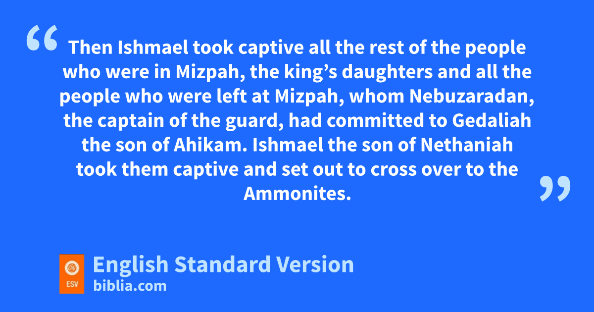 9 Now the cistern into which Ishmael had thrown all the bodies of the men whom he had struck down along with1 Gedaliah was the large cistern that iKing Asa had made for defense against iBaasha king of Israel; Ishmael the son of Nethaniah filled it with the slain. 10 Then Ishmael took captive all the rest of the people who were in Mizpah, jthe king’s daughters and all the people who were left at Mizpah, whom kNebuzaradan, the captain of the guard, had committed to Gedaliah the son of Ahikam. Ishmael the son of Nethaniah took them captive and set out to cross over to lthe Ammonites.